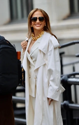 Дженнифер Лопес заметили в Нью-Джерси на съемках фильма «Office Romance». В тот день звезда блистала в роскошном брючном костюме, поверх которого она надела белоснежный тренч. Нежный образ она сочетала с противоположными по смыслу аксессуарами — массивным ожерельем на цепочке, темными солнцезащитными очками и черной сумкой-хобо.