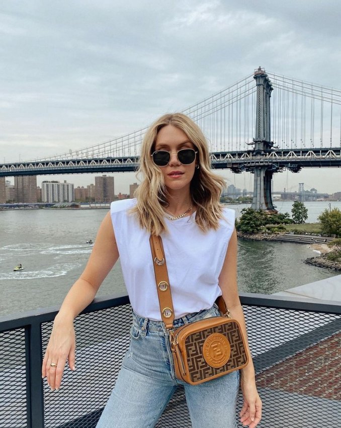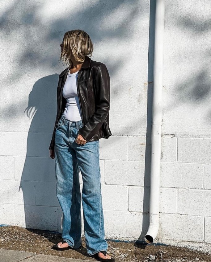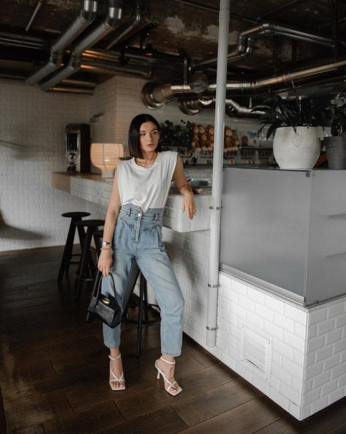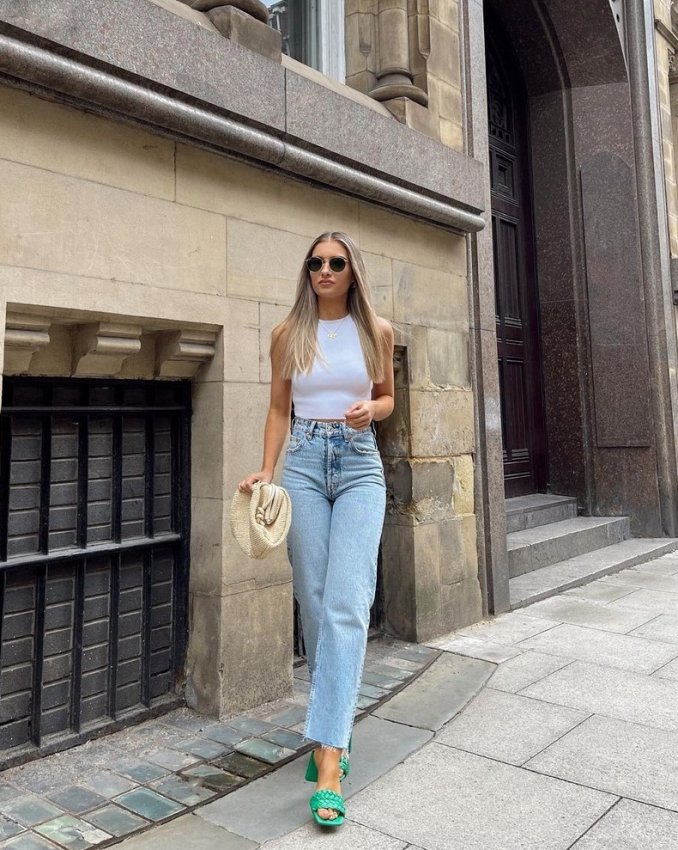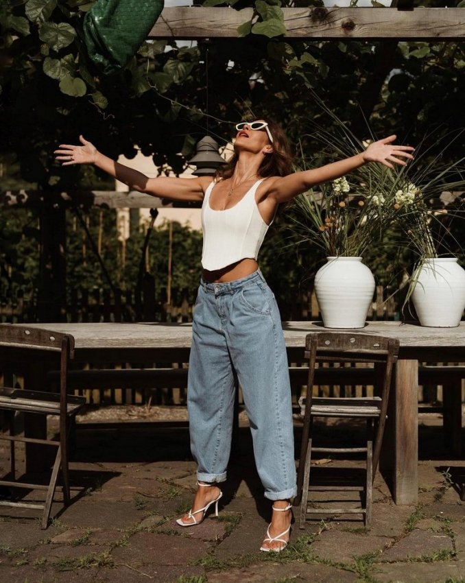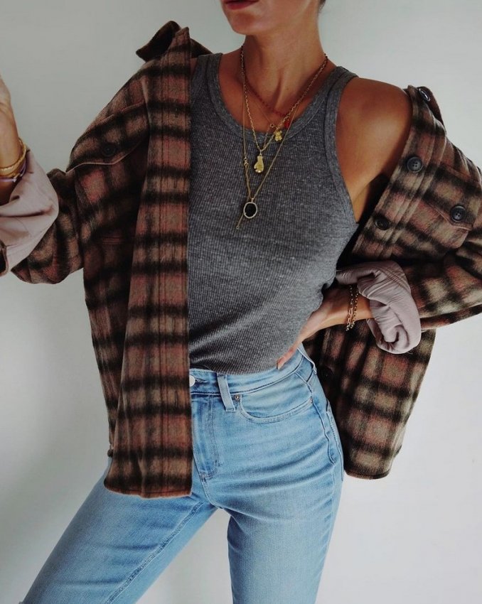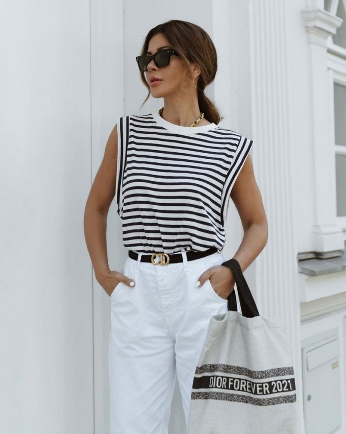 Подберите для себя сразу несколько вариантов майки весной и летом, которые могут отличаться фактурой ткани – гладкая или в рубчик, глубиной и формой вырезов, а также цветовой палитрой – белая, молочная, бежевая, капучино, коричневая, черная. Разнообразие маек в базовом гардеробе позволит сменят одну на другую, подбирая более подходящую под тот или иной лук.