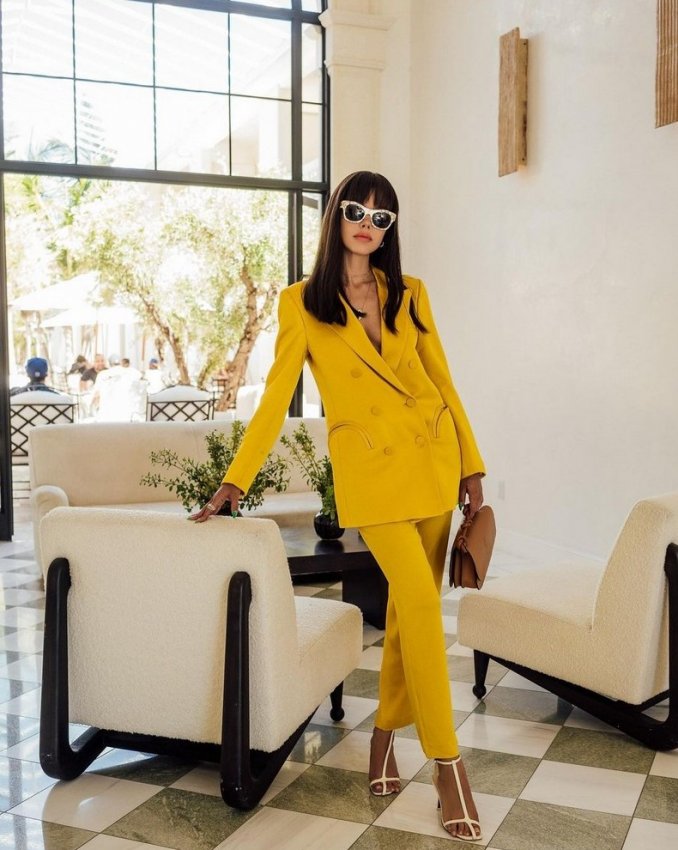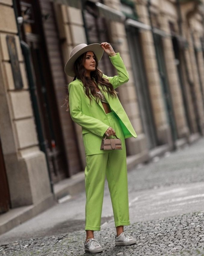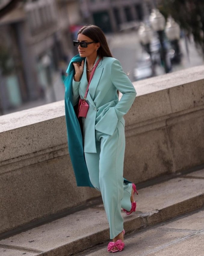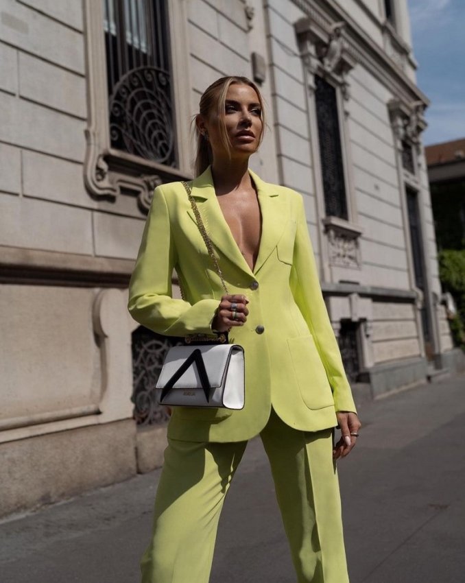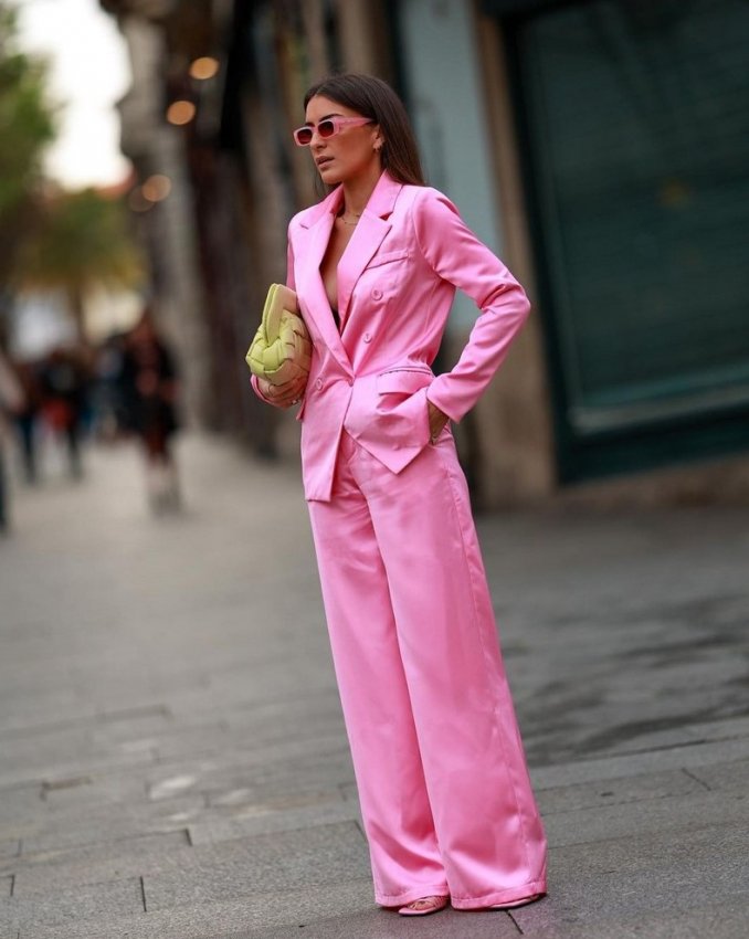 В тренде будут разные фасоны брючных костюмов – с двубортными пиджаками, удлиненными и оверсайз, а также разными вариантами брюк – широкими, клеш, укороченными, прямыми и зауженными. На теплый период очень стильно будут смотерться брючные костюмы в насыщенных оттенках – желтом, синем, зеленом, голубом, цвете лайма и фуксии, оранжевом.