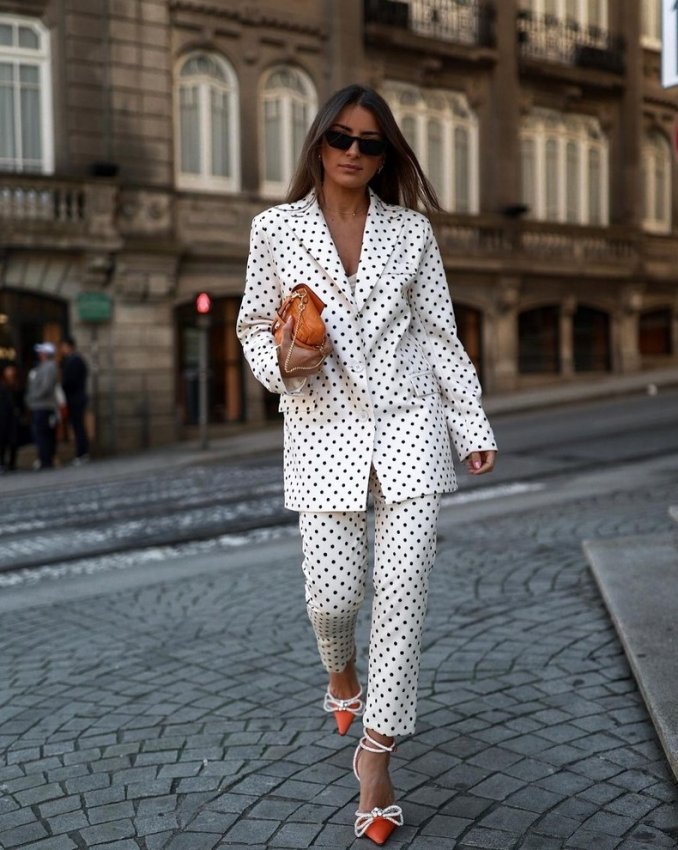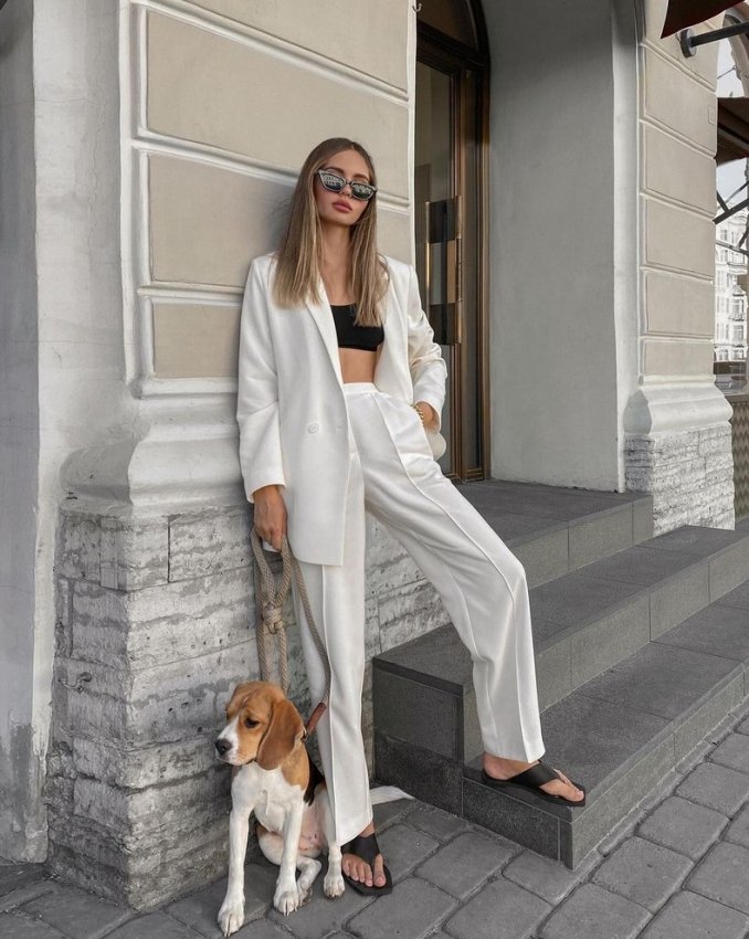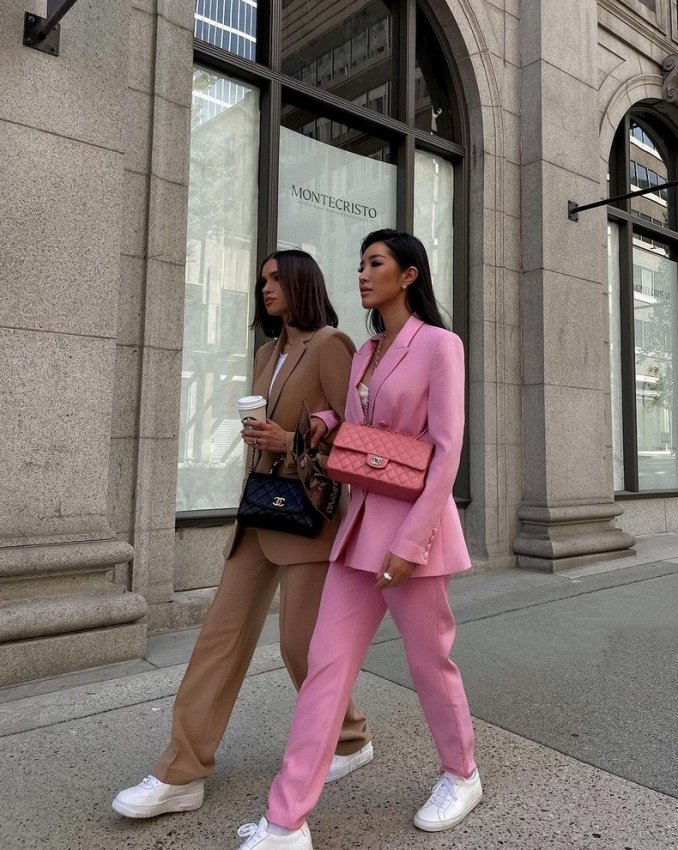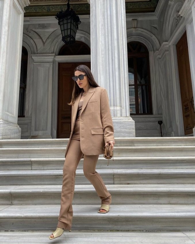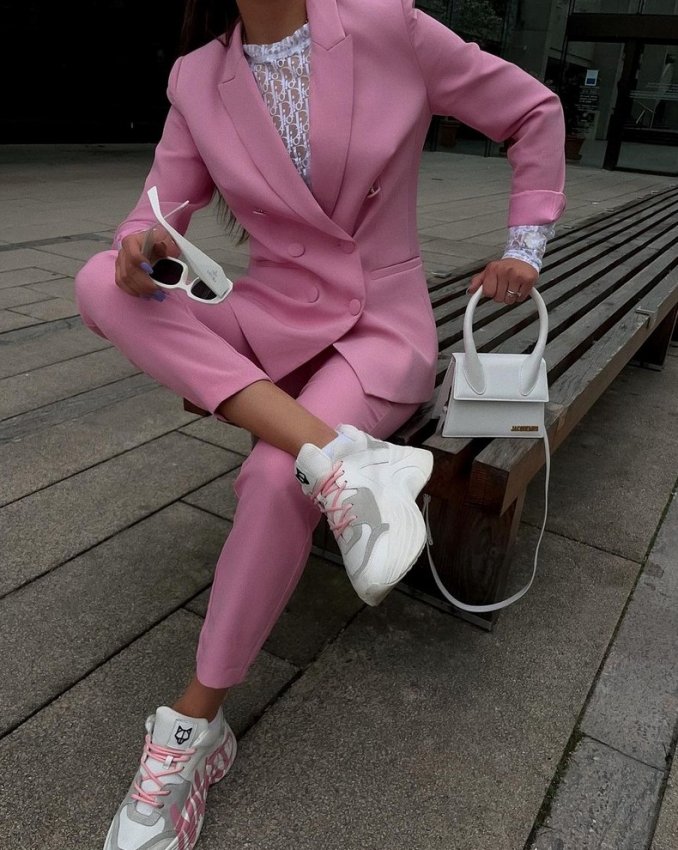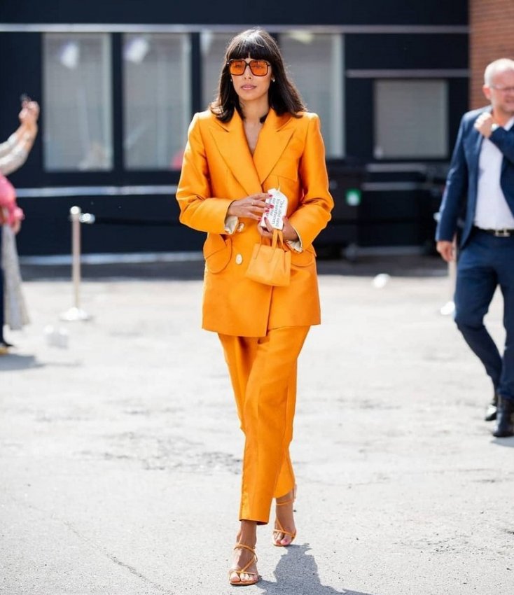 В тренде будут разные фасоны брючных костюмов – с двубортными пиджаками, удлиненными и оверсайз, а также разными вариантами брюк – широкими, клеш, укороченными, прямыми и зауженными. На теплый период очень стильно будут смотерться брючные костюмы в насыщенных оттенках – желтом, синем, зеленом, голубом, цвете лайма и фуксии, оранжевом.