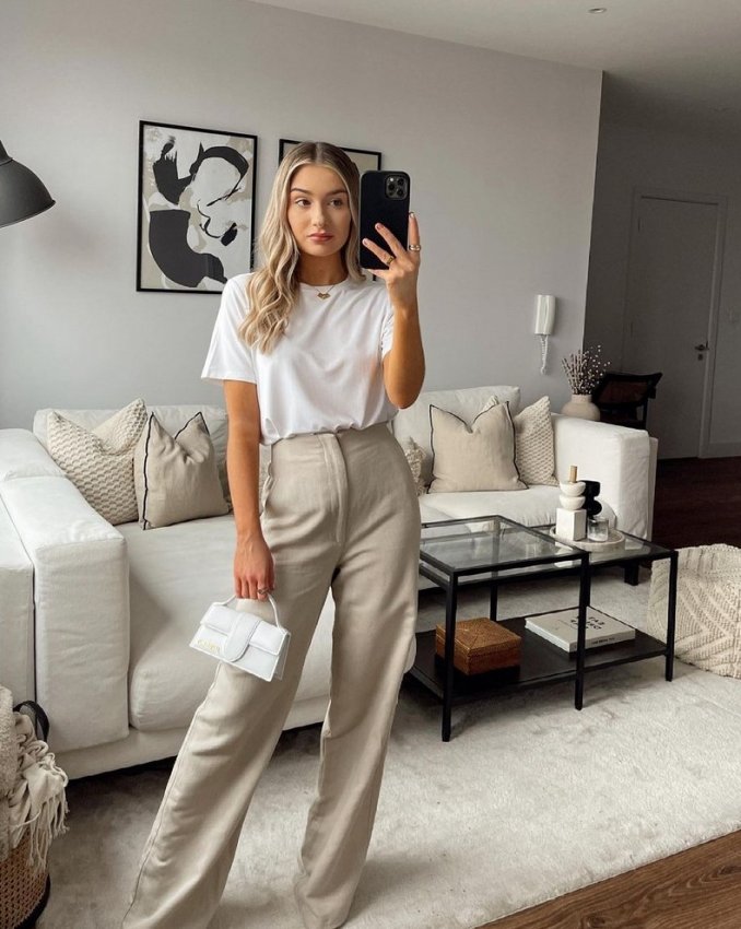 Актуальными будут разные фасоны футболок, выбирайте ту модель, в которой Вам комфортнее. Это могут быть футболки оверсайз или приталенные, модели поло и удлиненные, с небольшими рисунками и надписями в стиле минимализм.