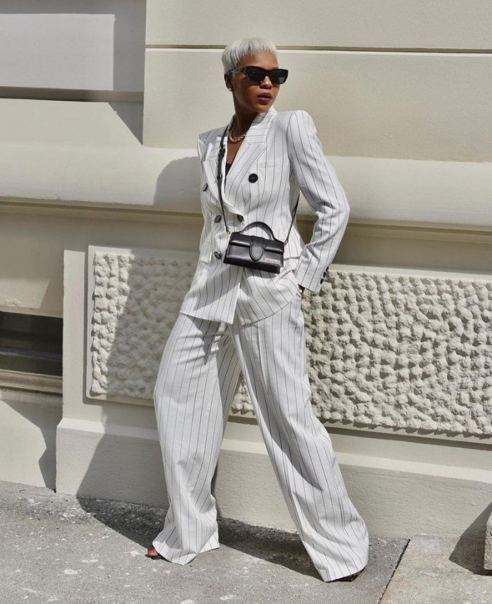 «Брючный костюм не требует никакого другого дополнения, как например, топ или майка, кроме как аксессуаров.»