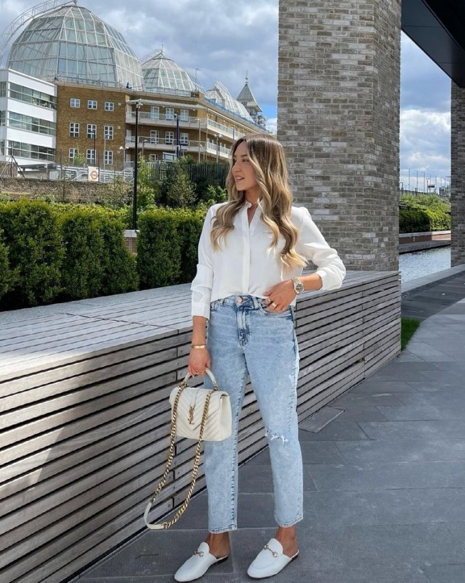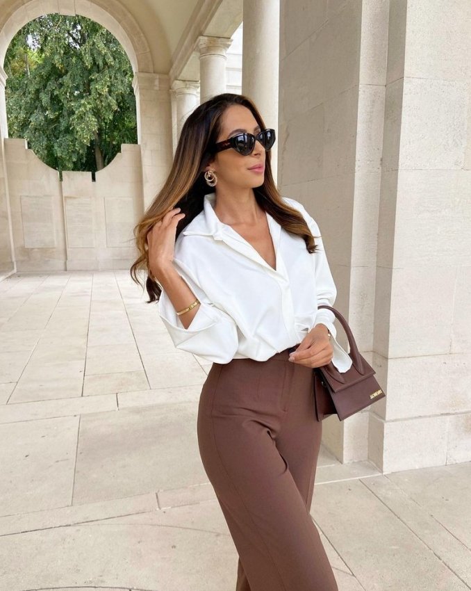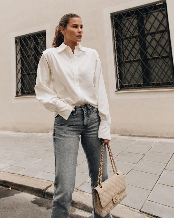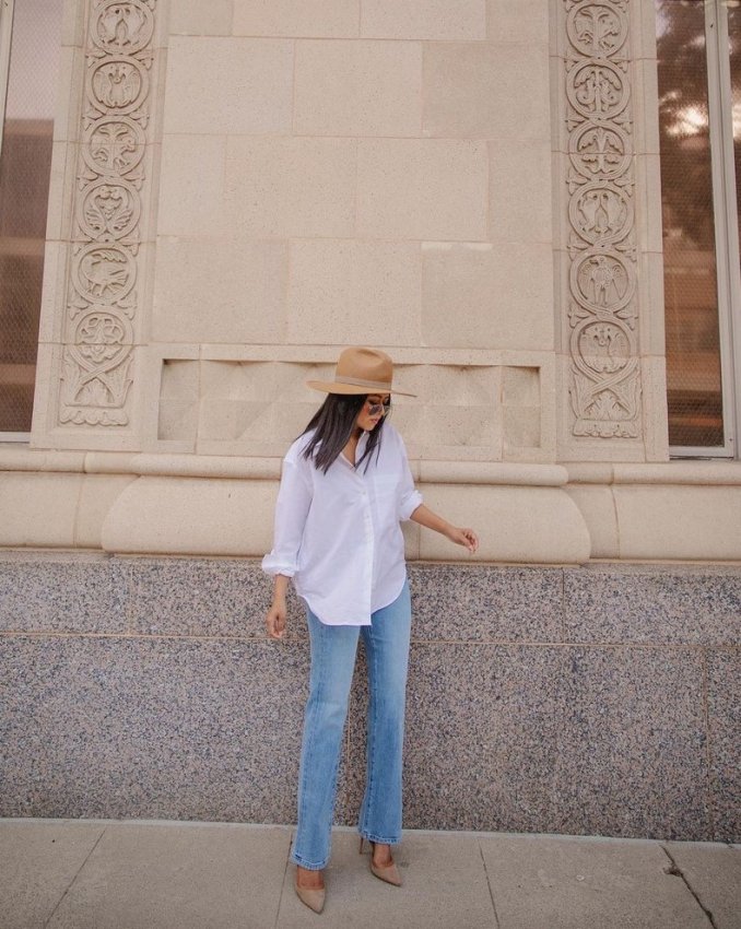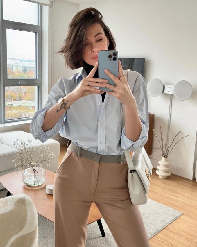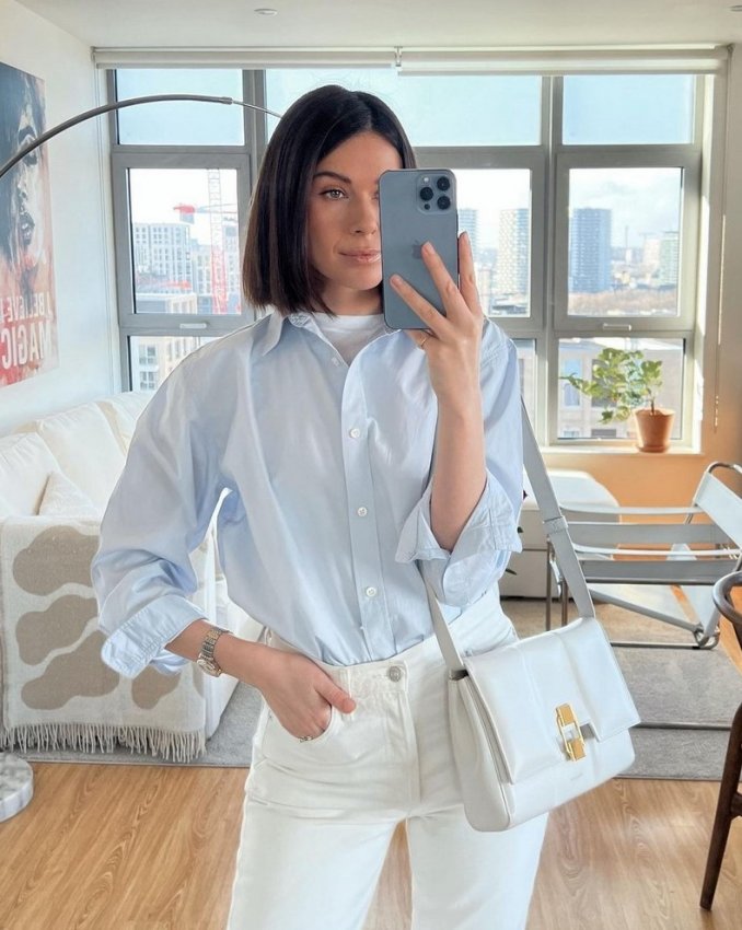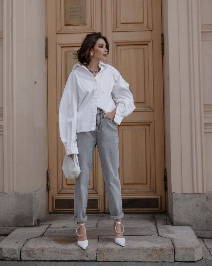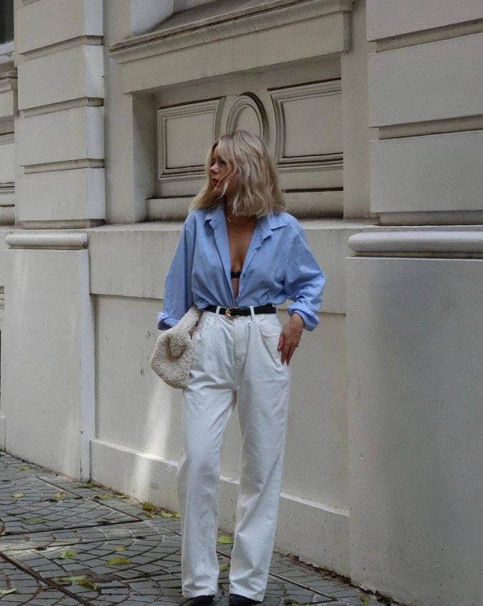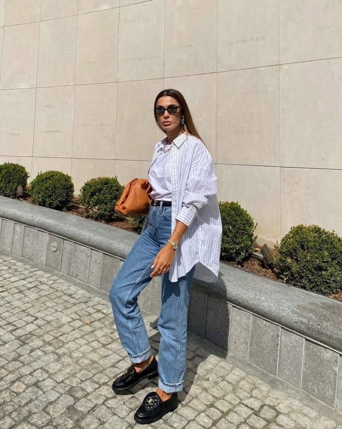 Предлагаем подобрать несколько рубашек в разных фасонах – приталенные и оверсайз. Цвета лучше выбирать светлые и пастельные – белый, молочный, бежевый, голубой. А вот носить базовые рубашки можно по-разному, в зависимости от капсулы. К примеру, в офис можно дополнить галстуком, а для прогулки надеть под рубашку кроп-топ или майку и носить нараспашку.