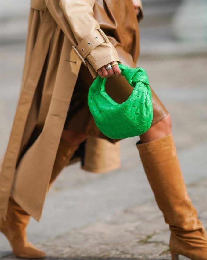 Плетение – еще один модный прием, который дизайнеры очень часто используют в новинках сумок. И если летом это были преимущественно соломенные модели, то осенью и зимой готовьтесь встречать плетеные кожаные сумки, а также вариации сумок с плетеными вставками. Пожалуй, одной из топовых будет яркая зеленая сумка-круассан в плетеном исполнении.С широким ремнем