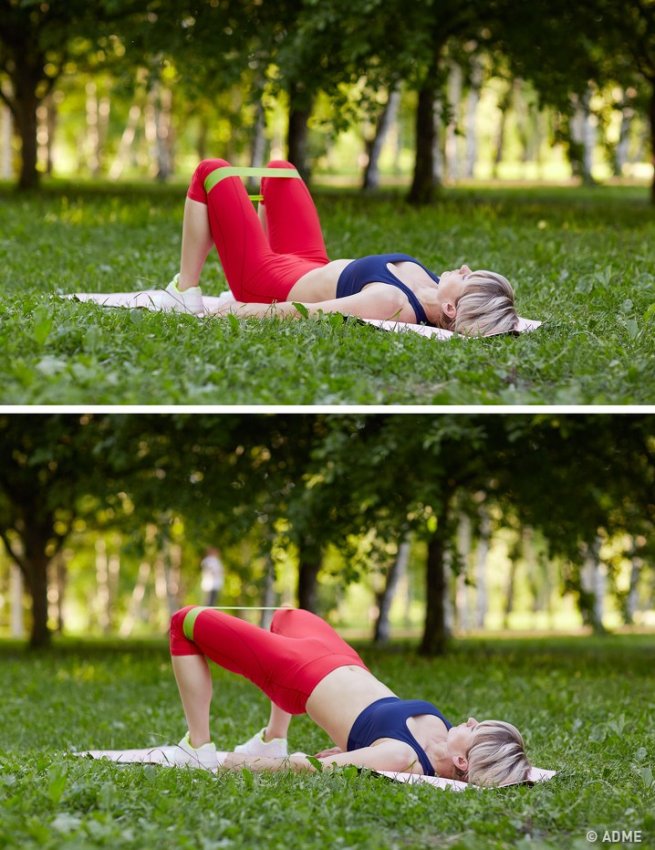 Исходное положение: ноги на ширине плеч, лента зафиксирована на бедрах чуть выше колен. Сделайте боковой шаг с полуприседом и повторите по 10–15 раз в каждую сторону.