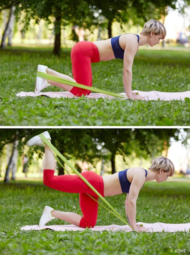Встаем на четвереньки и снова берем ленту за свободные концы, натягивая ее ногой. Выполняем 10–15 махов согнутой ногой вверх. Это упражнение отлично подкачивает мышцы ягодиц.