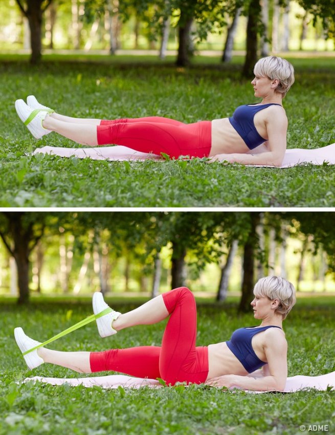 Ложимся на спину и упираемся локтями в пол. Фиксируем резинку на ступнях и делаем упражнение «велосипед» в течение 2–3 минут.