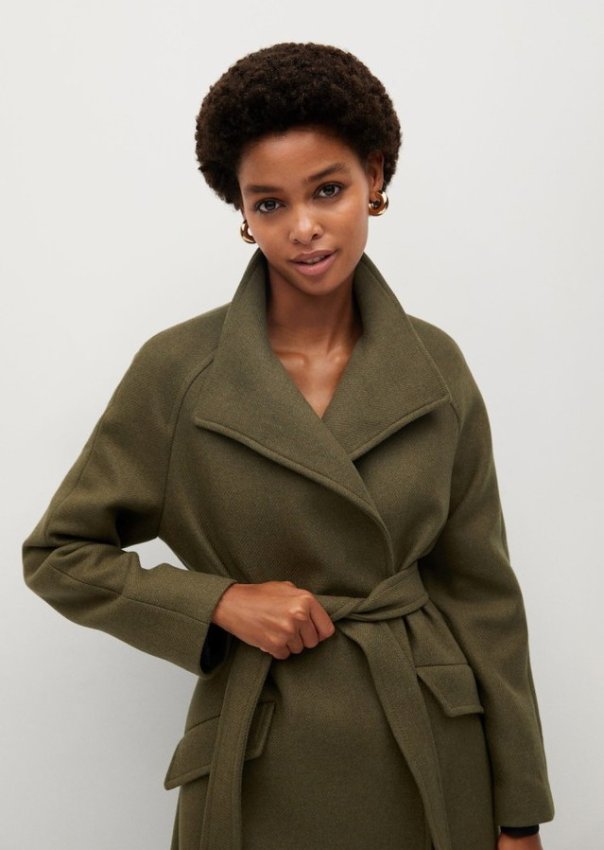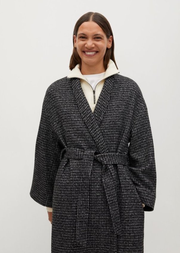 Пальто, представленное ниже, имеет фасон халата с поясом, модный в этом сезоне. На первый взгляд кажется, что у него нет пуговиц. На самом деле такие модели чаще всего снабжены потайной застежкой.