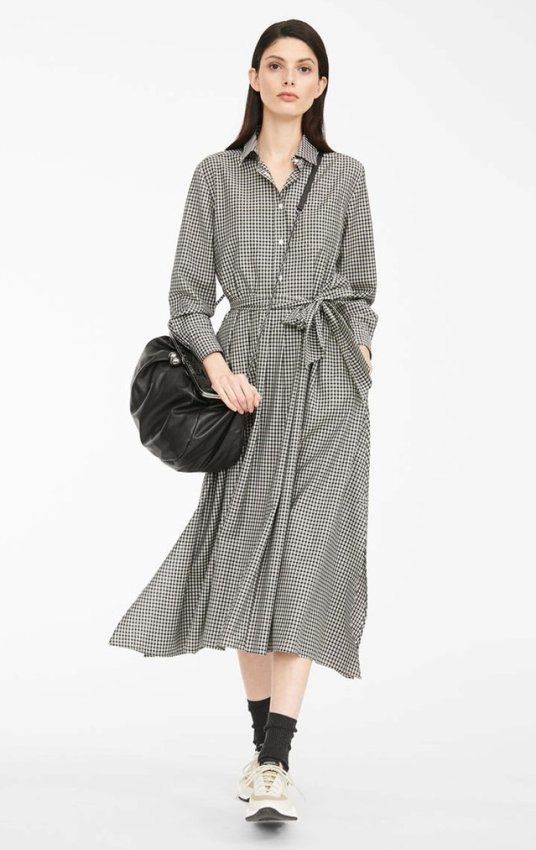 Еще одно платье-рубашка, на этот раз выполненное из ткани в мелкую черно-белую клетку (она называется «виши»). Характерные детали те же самые: длина миди, мужской воротничок, длинные рукава. Обратите внимание, что сейчас почти все вещи, включая нарядные, можно носить с кедами или кроссовками.