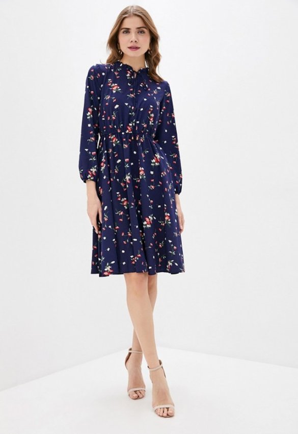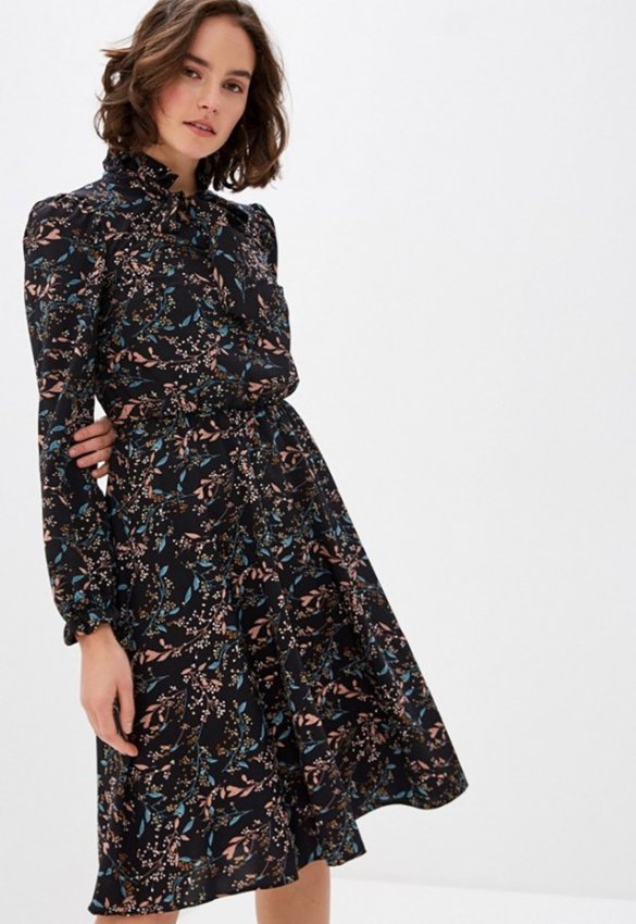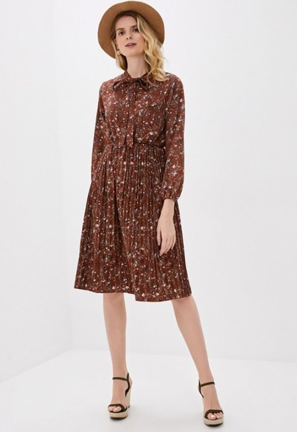 Хит сезона 2020 — принты в виде мелких цветочков, густо покрывающих фон. В мире моды такие принты называются «бабушкин узор». Платье, показанное ниже, имеет модную деталь: воротник-стойку, переходящий в бант с длинными концами. Сейчас такие воротники-банты часто используются в платьях и, особенно, блузках. Юбка плиссированная, плиссе по-прежнему актуально.