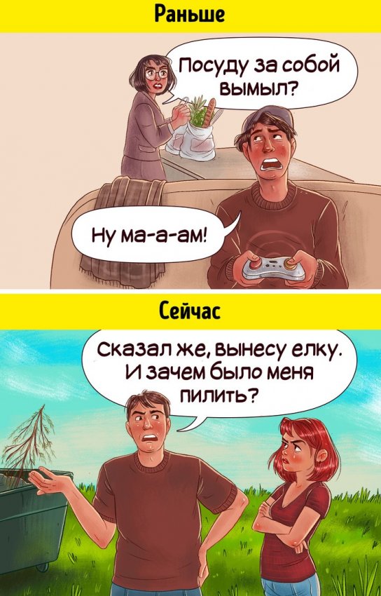 Такие выводы можно транслировать на семейную жизнь в зрелом возрасте. Полноценная помощь партнера по дому — это не вынос елки в мае после сотни причитаний, а равноправное участие в планировании дел.