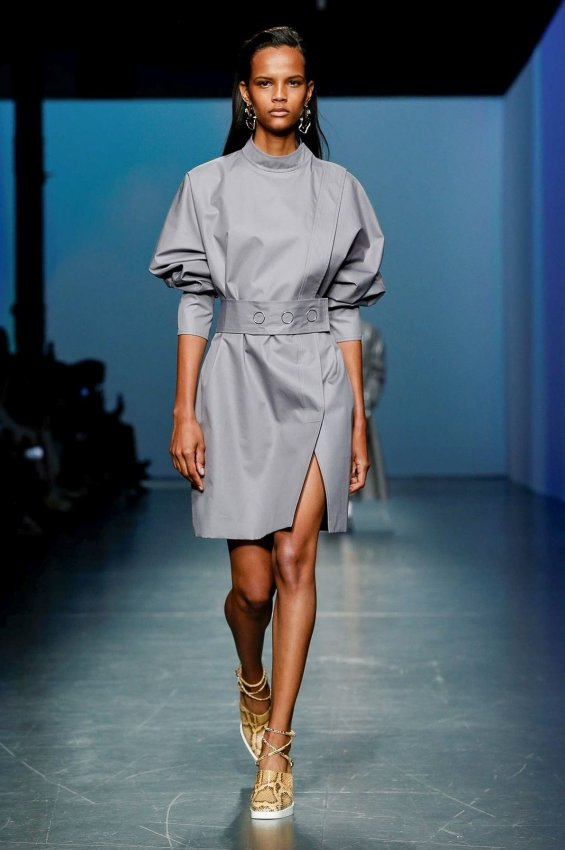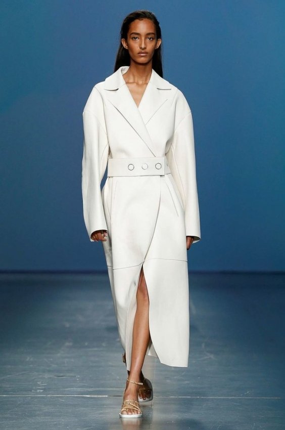 Монохром; строгий, но асимметричный крой; акцент на талии; объём.