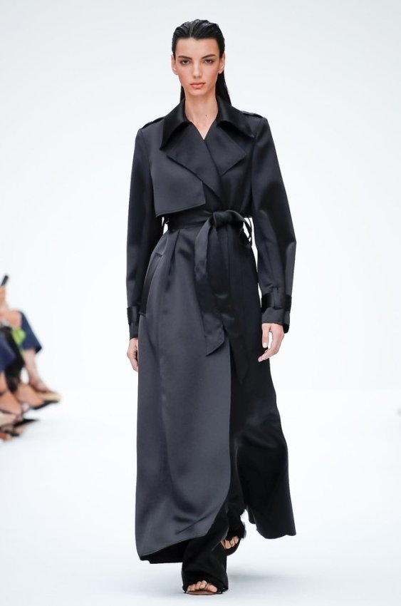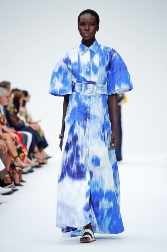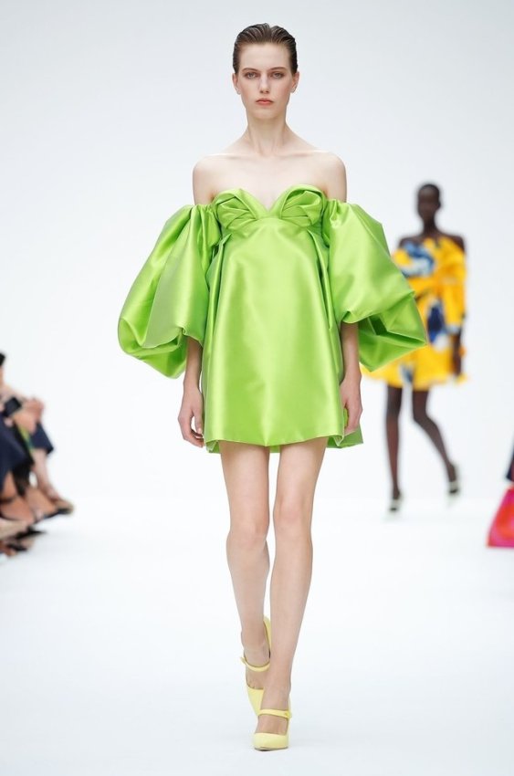 Макси-длина; насыщенные оттенки желтого, синего и зеленого; объемные рукава; четкий акцент на талии; минимализм.