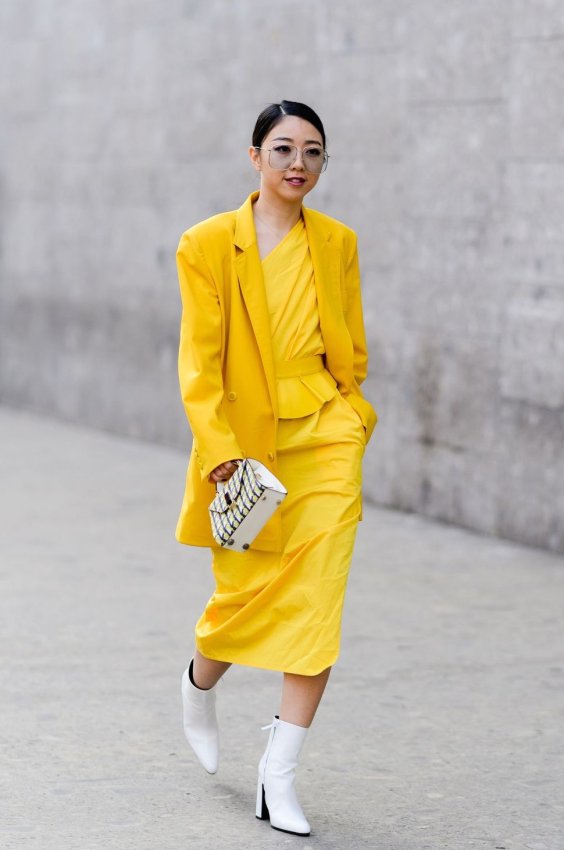Осенью все начинают переодеваться из яркой летней одежды в темное. И тут как раз отличный шанс выглядеть ярко, собрав тотал лук в одном оттенке. Желтый хорош, правда подходит далеко не всем. Но и в более универсальных цветах — глубокий синий, зеленый — вы будете выглядеть не менее приметно. Кстати, заметьте, что яркости добавляют еще и белоснежные аксессуары.