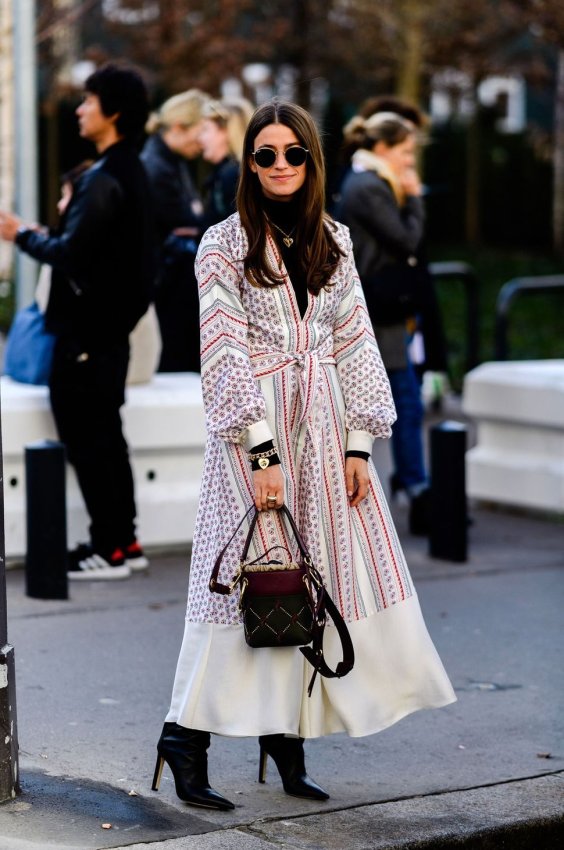 Длинное летнее платье или сарафан вполне можно носить и осенью, если сверху надеть фактурный и объемный свитер. Правда, вместо таких сапог я бы посоветовала выбрать тяжелые и грубые ботинки на шнуровке — и более стильно, и более удобно.