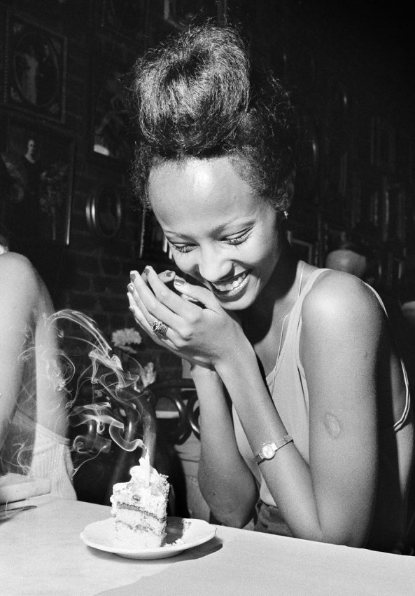 Иман празднует свой 21-й день рождения в одном из ресторанов Нью-Йорка, 1976 год.
