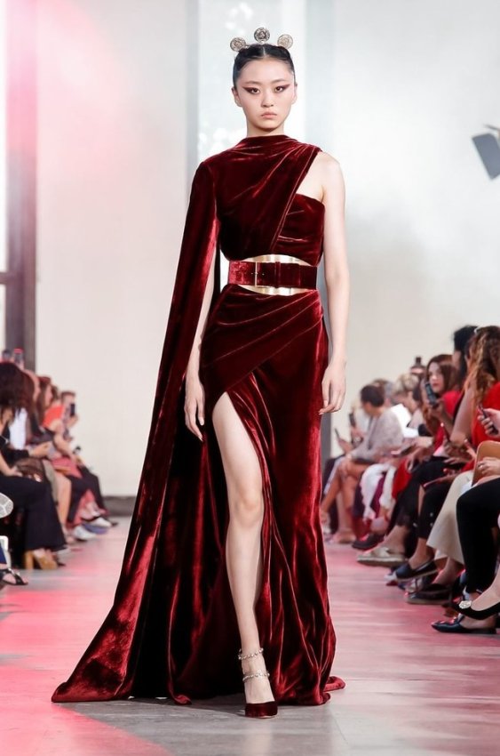 Четкий акцент на талии, сделанный с помощью широких бархатных поясов с золотой пластиной; глубокий разрез; открытые плечи.