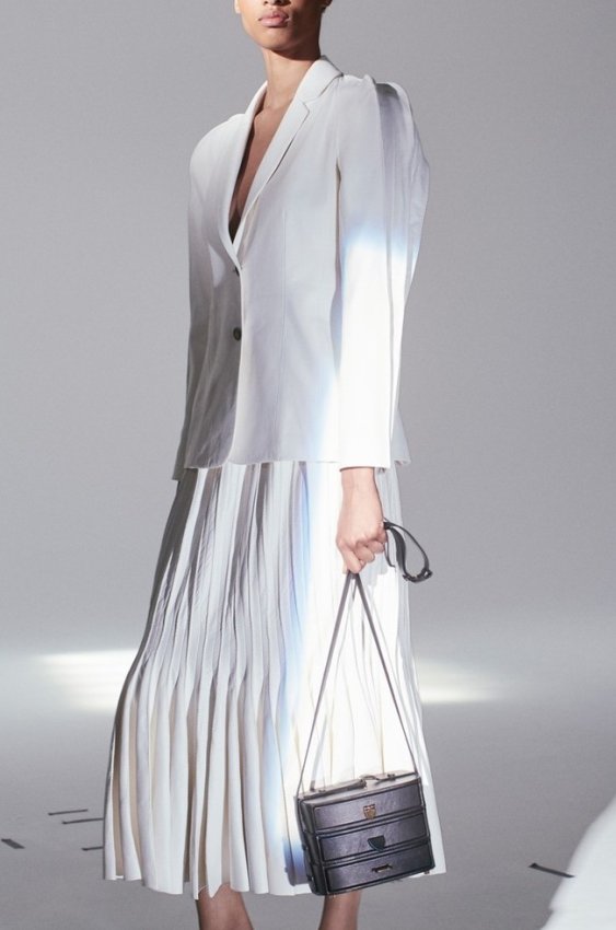 Как носить очень, очень протокольный комплект и не выглядеть заурядно? Наше предложение: выбирать вещи в белом цвете! В дополнение можно поэкспериментировать с фактурами: пусть юбка будет, например, плиссированной или из струящейся ткани, как в лукбуках Gabriela Hearst и Vince.