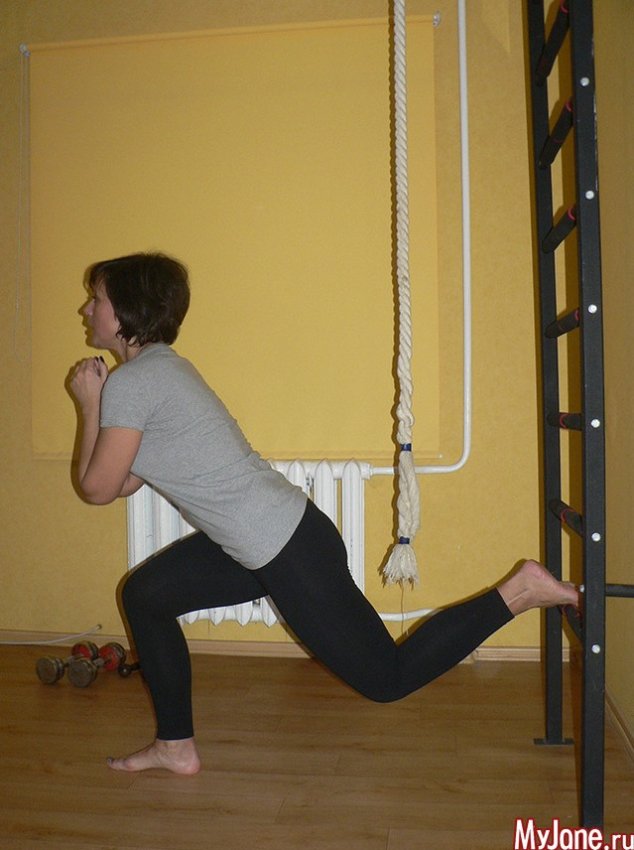 Встаньте прямо. Одну ногу отведите назад и зафиксируйте ее стопу на перекладине шведской стенки (варианты: сидении стула или дивана). Сгибайте обе ноги в коленях, опускайте таз вниз. Следите, чтобы колено передней ноги не выступало за ее большой палец. Возвращайтесь в исходное положение. После рекомендованного числа повторов выполните упражнение, сменив опорную ногу.