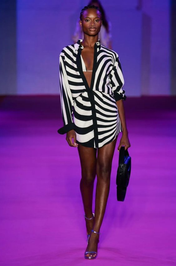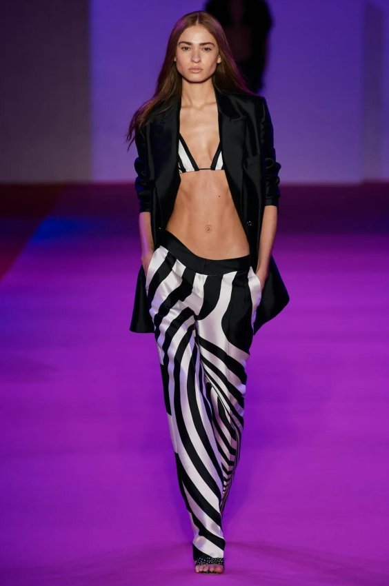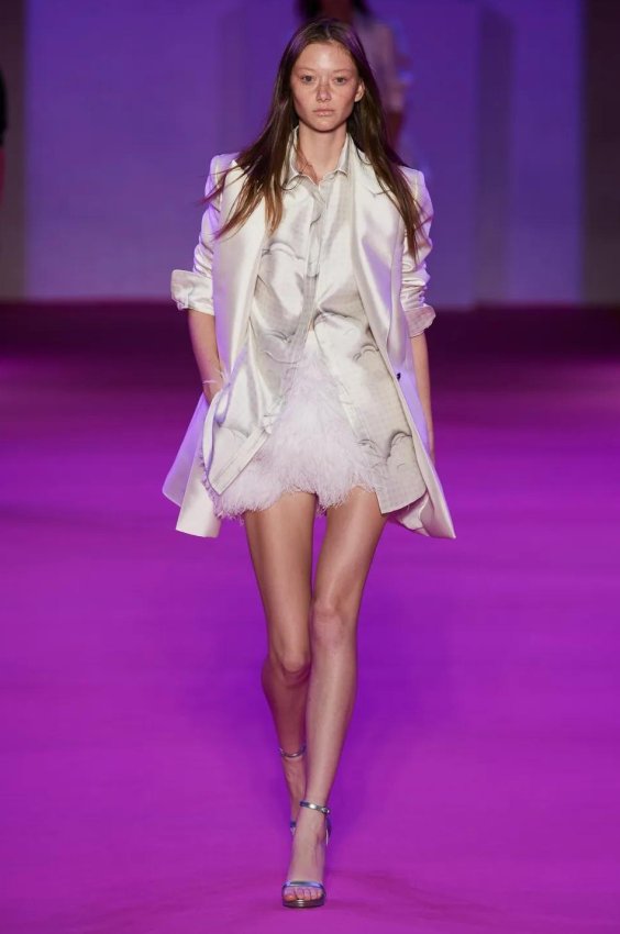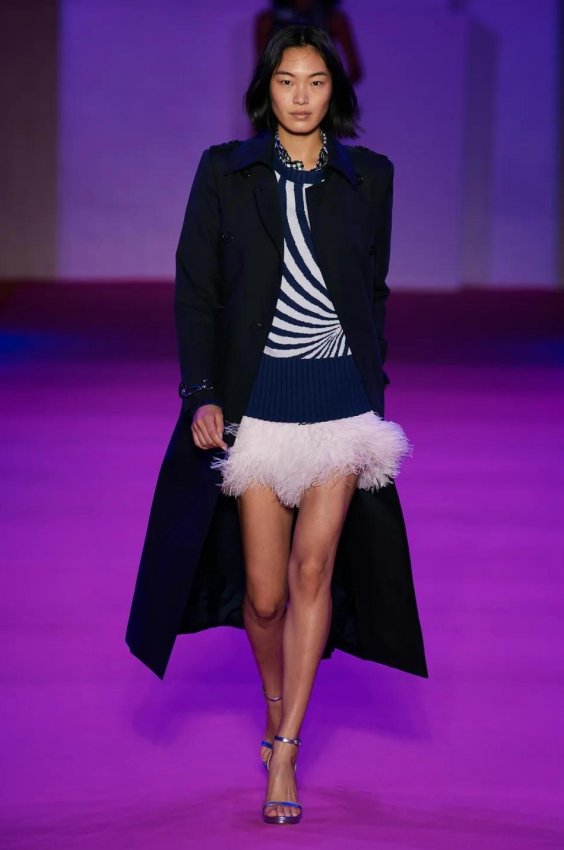 Придать вещам гипнотизирующий эффект Брэндон Максвелл решил с помощью черно-белого принта, смотря на который на секунду может закружиться голова. Особое место в коллекции также занимают пайетки — из них были выполнены клетчатые топы, плиссированные юбки, поло и бомберы. Но особенно нам запомнился выход модели в строгом пальто и длинном свитере, из под которого выглядывала перьевая юбка — изящный способ добавить немного праздника в повседневность.