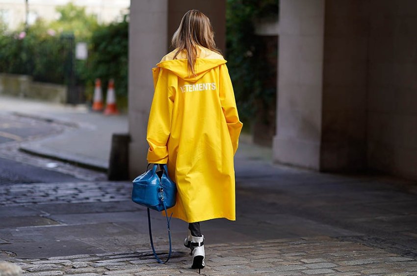 Самый очевидный вариант, если выход на улицу в ливень неизбежен. Дождевик давно не считается элементом гардероба, который никогда не вписывается в образ. Модные блогеры сумели адаптироваться под капризы погоды и выстроить образ вокруг дождевика. Фаворитом героев street style-хроники стал знаковый плащ Vetements с фирменным логотипом марки на спине и груди.