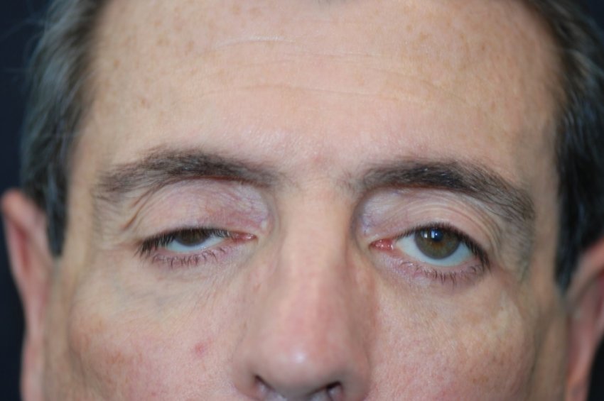 При глазной форме миастении наблюдается ослабление мышц, отвечающих за движение глазного яблока. При этом возникает двоение в глазах и опущение век.