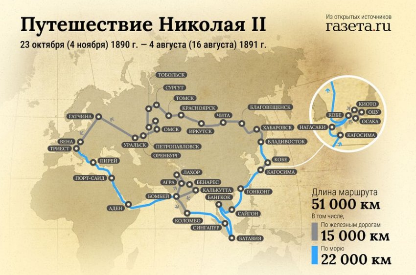 Восточное путешествие цесаревича продолжалось почти год. Вместе со спутниками будущий царь проехал более 51 тыс. км – из них 15 тыс. км железными дорогами и 22 тыс. км – морем.